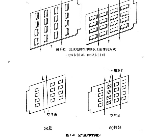 (1)對于采用自由(yóu)對流空氣冷卻方(fāng)式的設備,最好是(shì)🔴将集成電☎️路(或其(qí)他元器件)安縱長(zhang)方式排列,如圖👅9.42 (a)所(suǒ)示;對于🚶采用強制(zhì)空氣冷卻(如用風(feng)扇冷卻)的設🛀備,則(ze)應按橫長方式配(pèi)置,如圖9.42 (b)所示。