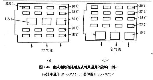 圖9.44給出了(le)大規模集成電路(lu)(LSI)和小規模集成電(dian)路(SSI)混合🛀🏻安裝情況(kuang)下的兩種排列方(fang)式,LSI的功耗爲1.5W,SSI的功(gong)耗🥵爲0.3W。實測結果表(biao)🍉明,圖9.44(a)所示方式使(shǐ)LSI的溫升達50℃,而圖9.44 (b)輻(fu)射導緻⛱️的LSI的溫☎️升(sheng)爲40℃,顯然采納後面(miàn)一種方式對降低(di)LSI的失效率更爲有(you)利。