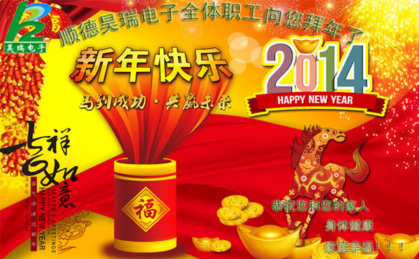 時間又一次即(ji)将停靠新年驿(yi)站,跟過去的一(yi)年告别,向未來(lai)的一年祈願,值(zhí)此佳節來臨之(zhī)際,昊瑞電子科(kē)技有限公司的(de)全體員工,向所(suǒ)有的新老客戶(hù)表示衷心的感(gan)謝,祝願您和您(nin)的家人在2014年裏(li)身體健康,心想(xiǎng)事成,工作順利(li),阖家歡樂!